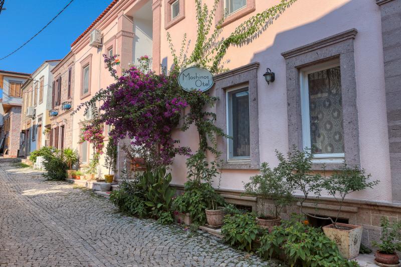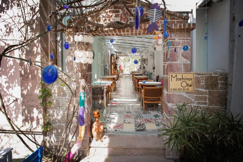 Ayvalık – Cunda'da bölgenin mimari yapısına uygun bir Rum evinde konaklama olanağı sunan Moshinos Butik Otel, plaja yalnızca 250 m yürüme mesafesindedir. Misafirlerine sıcak ve konforlu bir konaklama olanağı sunmayı amaçlayan tesisin ortak alanlar ve odalar dahil olmak üzere genelinde ücretsiz Wi-Fi erişimi sağlanmaktadır. Moshinos Butik Otel'in beyaz rengin ağırlıklı olduğu tüm odalarda duşlu özel banyo yer almaktadır. Havlu, saç kurutma makinesi ve terlik ile donatılan bu özel banyolarda 24 saat sıcak su bulunmaktadır. Klimalı olan birimlerde ayrıca oda temizlik hizmeti de mevcuttur. Moshinos Butik Otel'de sabahları taze ve organik ürünlerle hazırlanan açık büfe kahvaltı servis edilmektedir. Geniş bir bahçesi de bulunan tesiste misafirler dilerse kahvaltılarını yapabilmektedir. Tesisin resepsiyonu 7 gün 24 saat boyunca açıktır ve hizmet vermektedir. Konaklamanız boyunca Cunda Adası Pateriça Köyleri'ni günlük planınıza dahil ederek yörede keyifli bir gün geçirebilirsiniz.